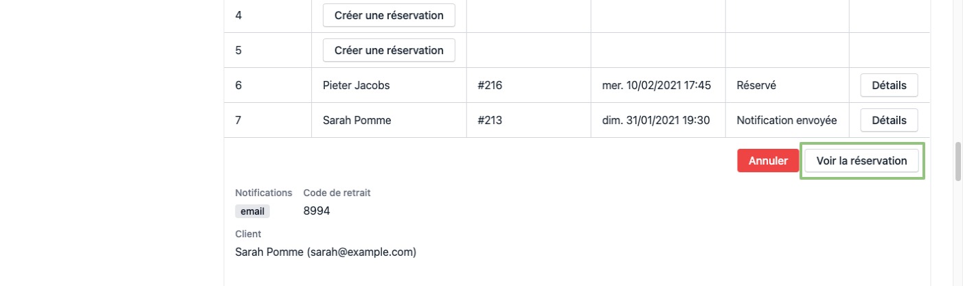 Une réservation peut être modifiée dans «Vue d'ensemble», «Réservations» ou dans Casiers. Pour plus d’informations à propos des autres pages consulter: