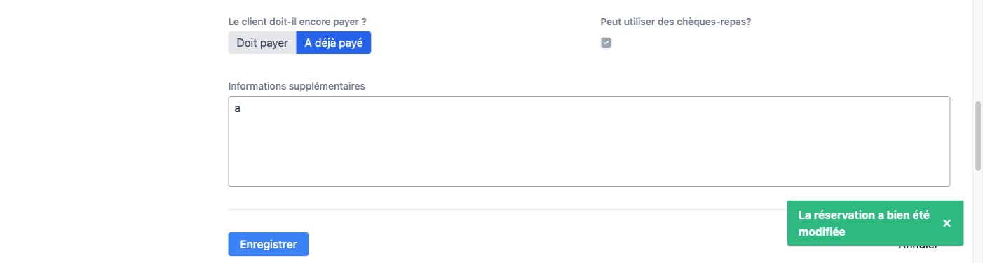 - La page sera actualisée automatiquement après une modification réussie. Vous verrez une notification en bas à droite indiquant que la réservation a été modifiée avec succès.