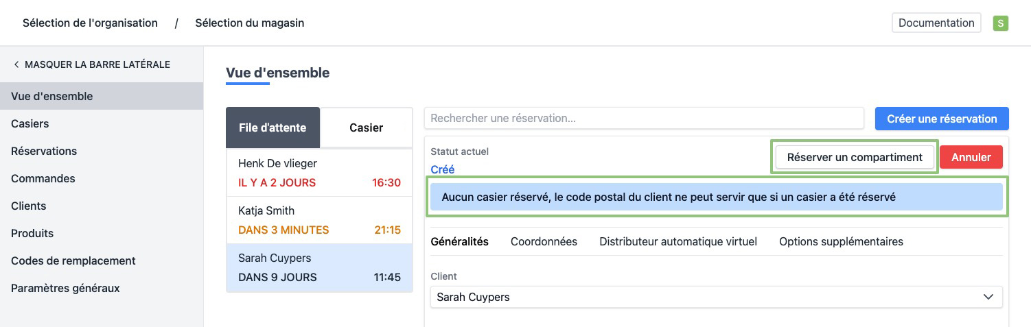 Une réservation peut être placée dans une boîte à "Vue d'ensemble", "Réservations" ou "Casiers". Pour plus d'informations sur les autres pages, consultez: