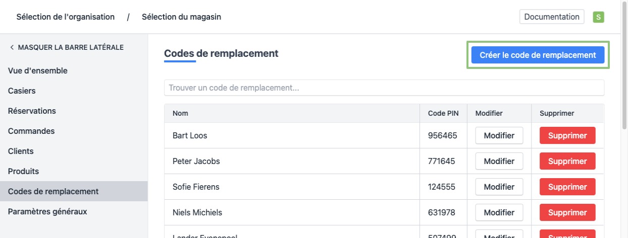 - Une liste de tous vos codes de remplacement actuellement utilisés vous sera présentée. Cliquez en haut à droite sur "Créer un code de remplacement".