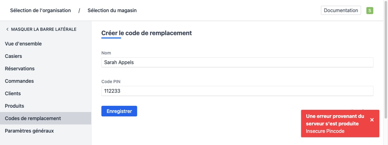 Attention, les codes évidents tels que "123456" ou "778899" ne seront pas acceptés. Si vous entrez quand même ceci et cliquez sur ** "Enregistrer" **, vous verrez un message d'erreur.