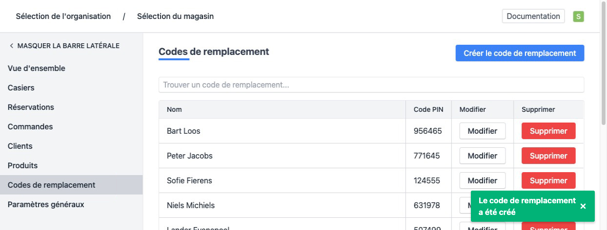 Attention, un maximum de 10 codes de remplacement peut être créé.