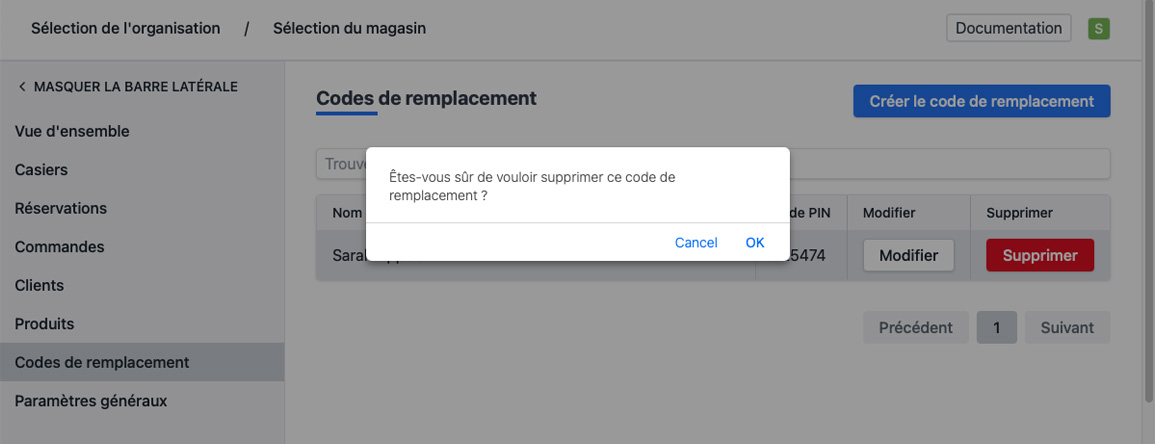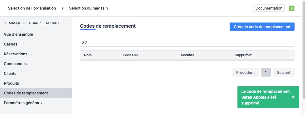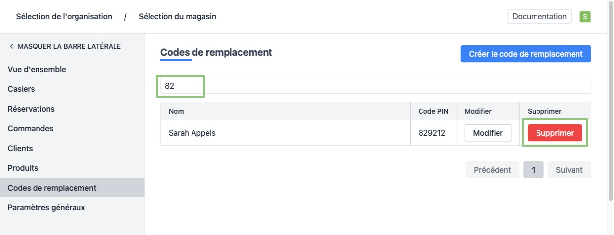 - Une liste de tous vos codes de remplacement actuellement utilisés s'affichera.
