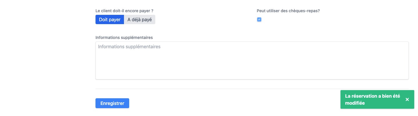 La page sera actualisée automatiquement après une modification réussie. Vous verrez une notification en bas indiquant que la réservation a été ajustée avec succès.