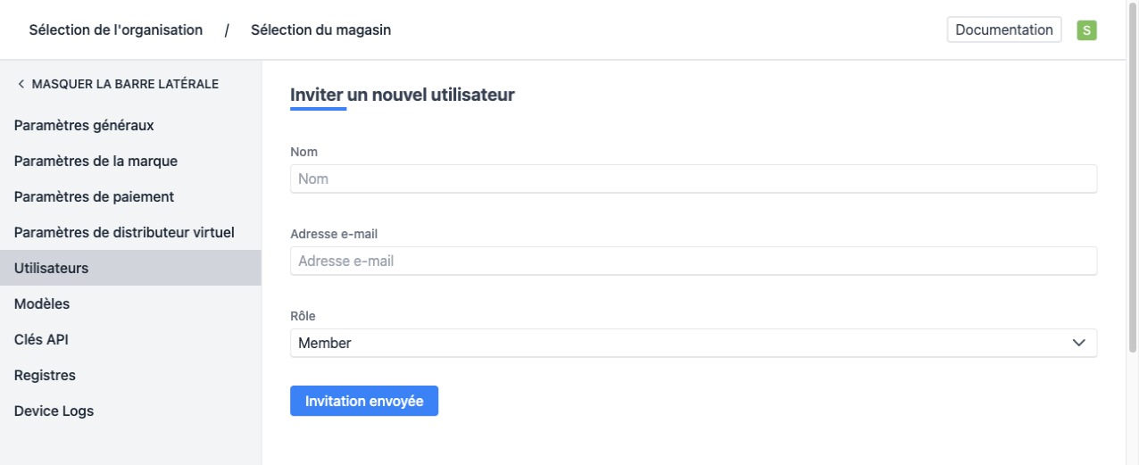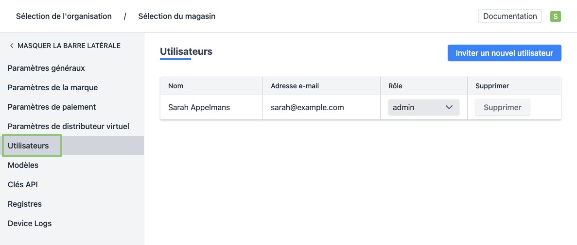 - Rôle - Il y a 2 rôles disponibles: Admin et Member. Un administrateur a plus de droits. Il peut, par exemple, modifier les paramètres de l'organisation. Un membre n'a pas les droits sur les paramètres et les codes de remplacement. Utilisez le rôle de membre pour votre personnel.
