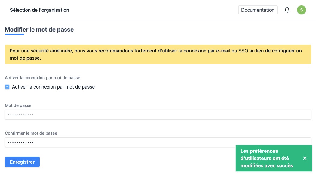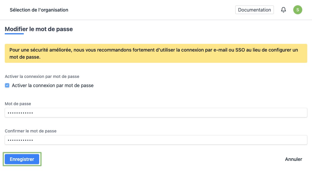 Attention! Pour une sécurité améliorée, nous vous recommandons fortement d'utiliser la connexion par e-mail ou SSO au lieu de configurer un mot de passe. Lorsque vous utilisez la méthode de connexion unique, un code sera envoyé à votre adresse e-mail chaque fois que vous souhaitez vous connecter. Vous entrez ensuite le code dans le site comme étape de connexion finale.